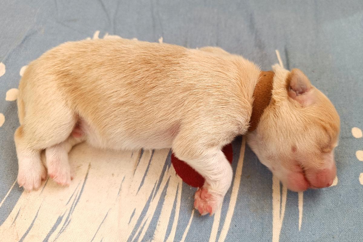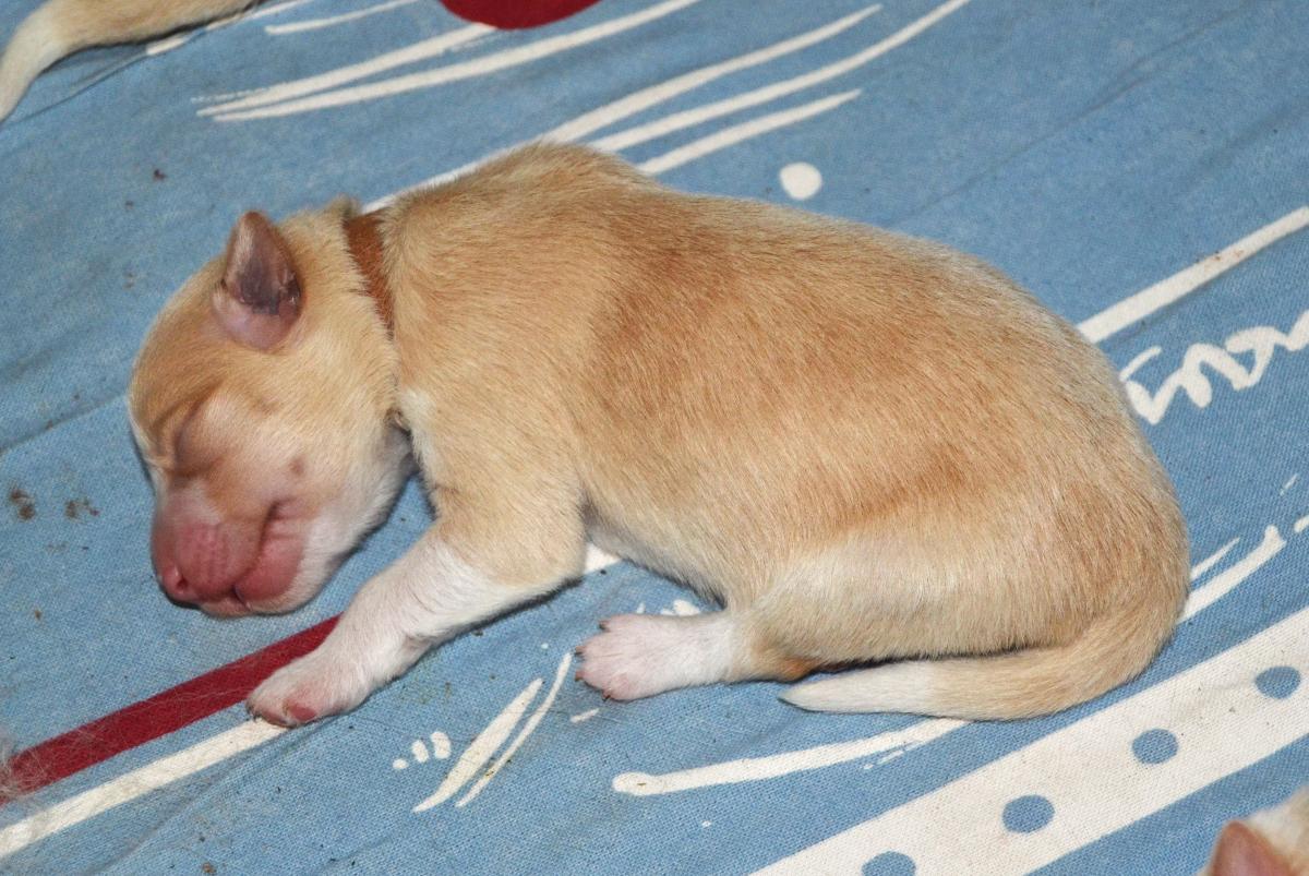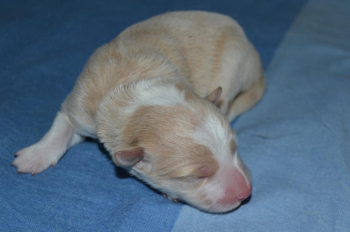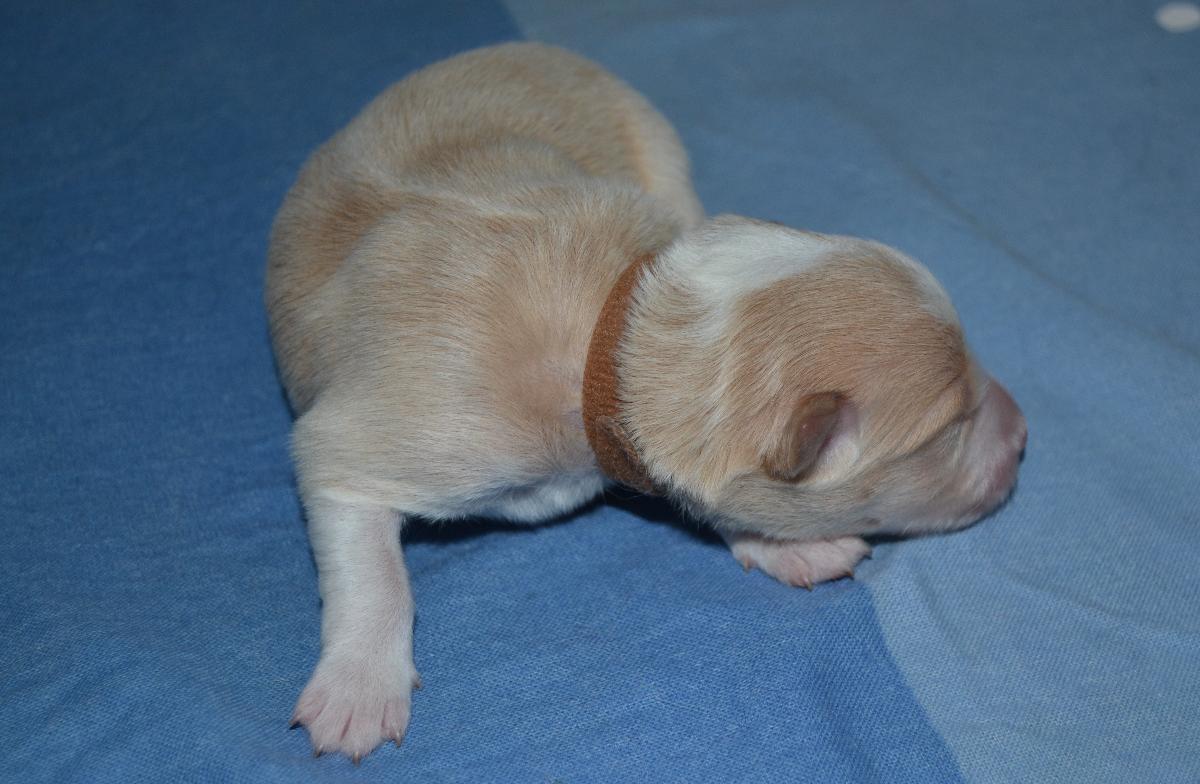 Naše prázdninová naděje - krásně pravidelný pejsek. Často lehává s Honeyem , spolu zaspí krmení a pak se na mámu dobývají spolu. Váží 567 gramů.