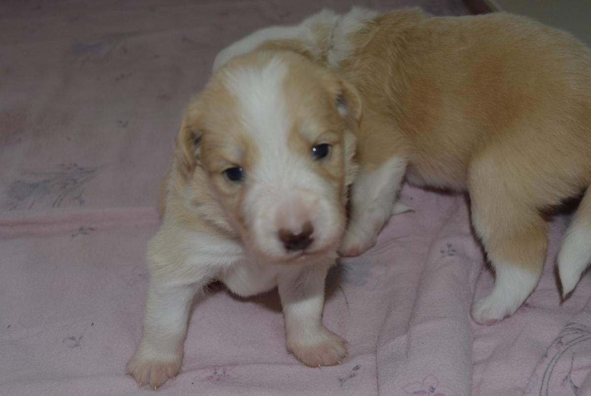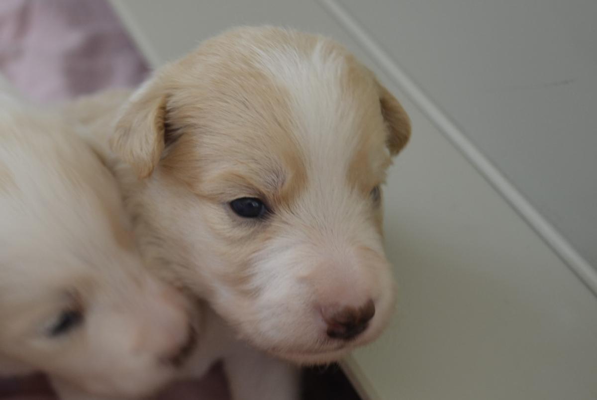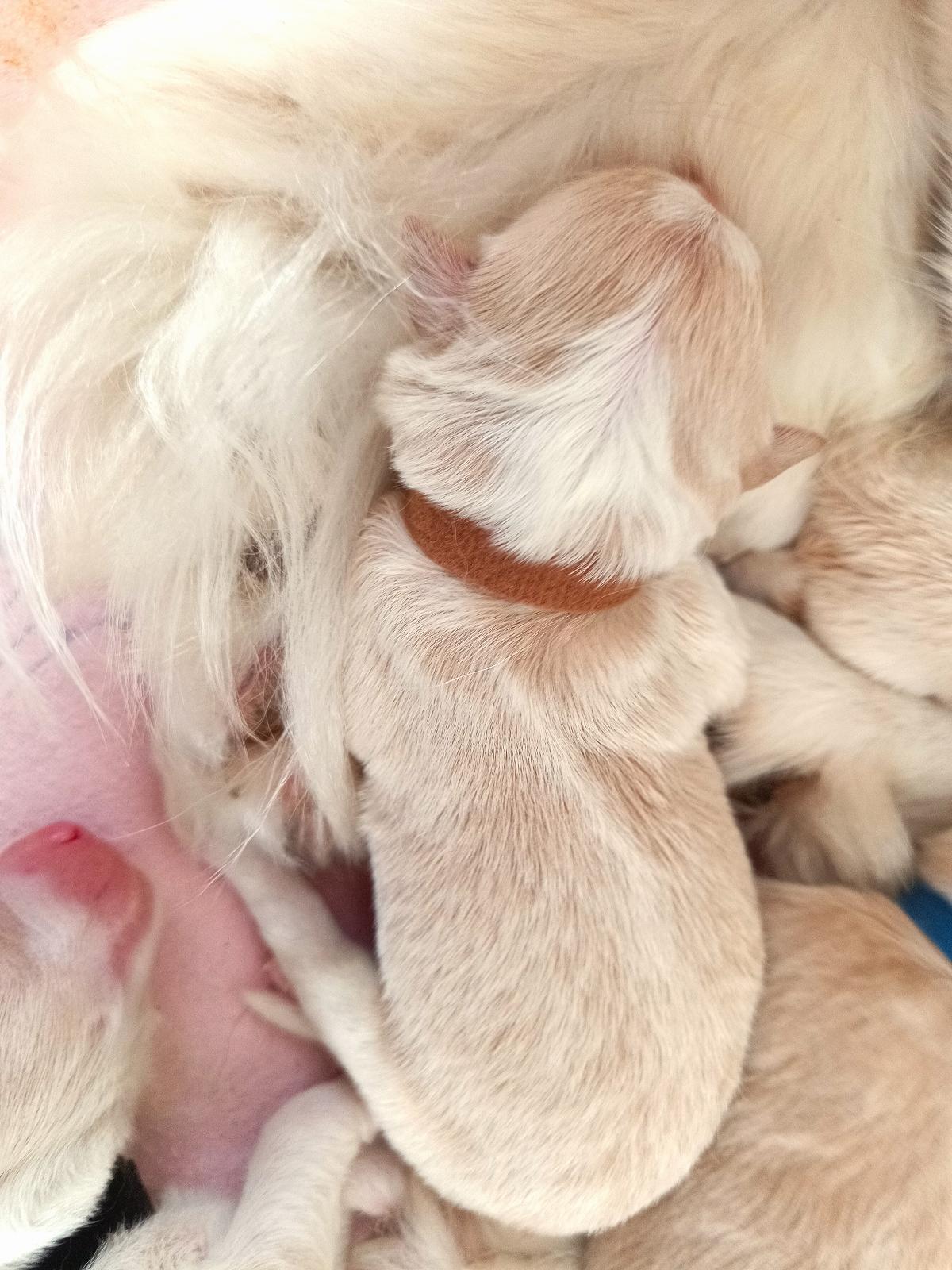 Naše prázdninová naděje - krásně pravidelný pejsek. Často lehává s Honeyem , spolu zaspí krmení a pak se na mámu dobývají spolu. Váží 567 gramů.