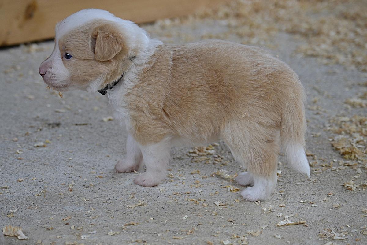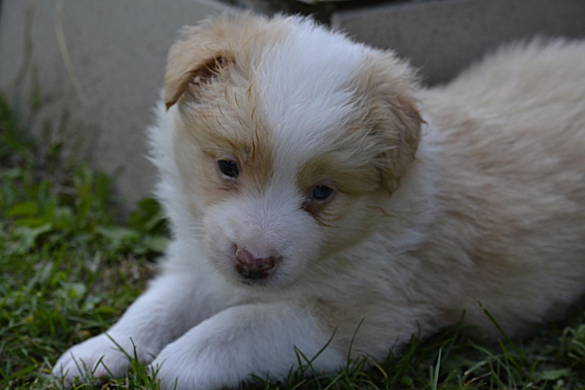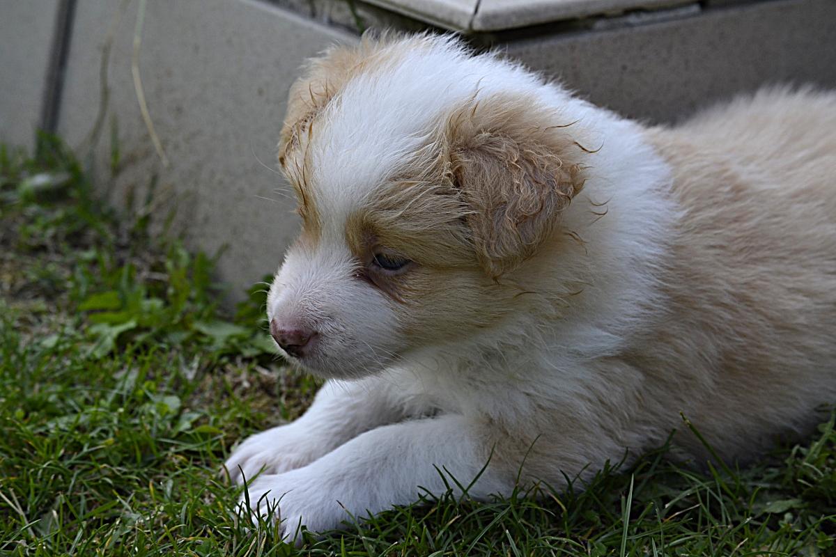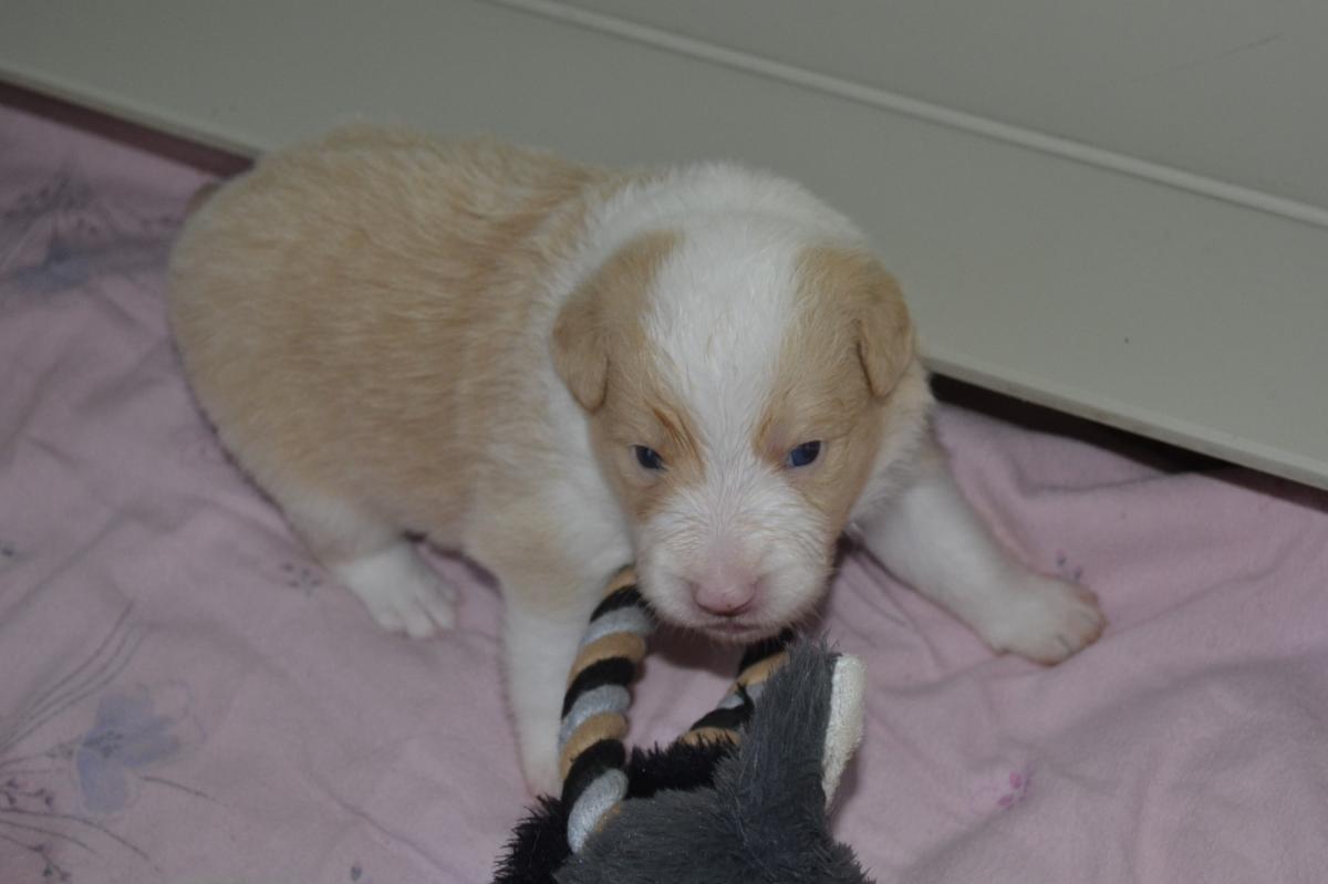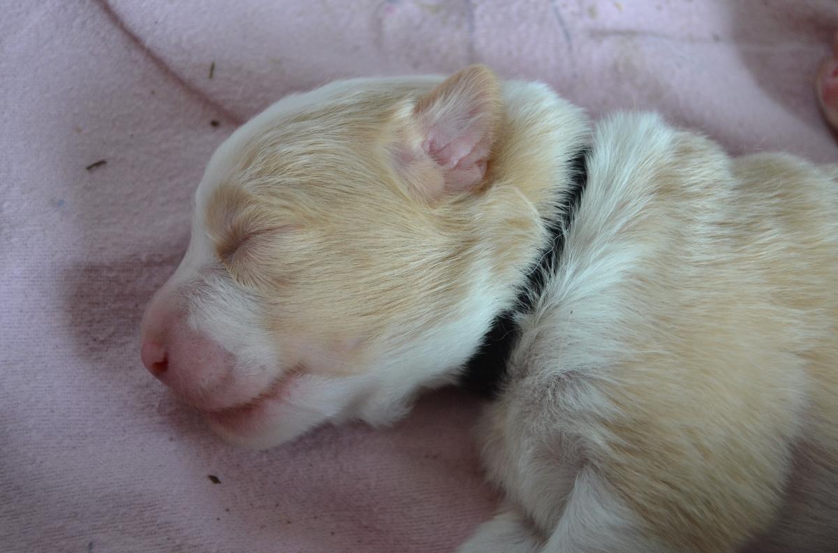 Hardy je klidný, pohodový pejsek. Váří 1111 gramů. S největší pravděpodobností bude mít modré oči, to proto, že po tatínkouvi nese merle gen.